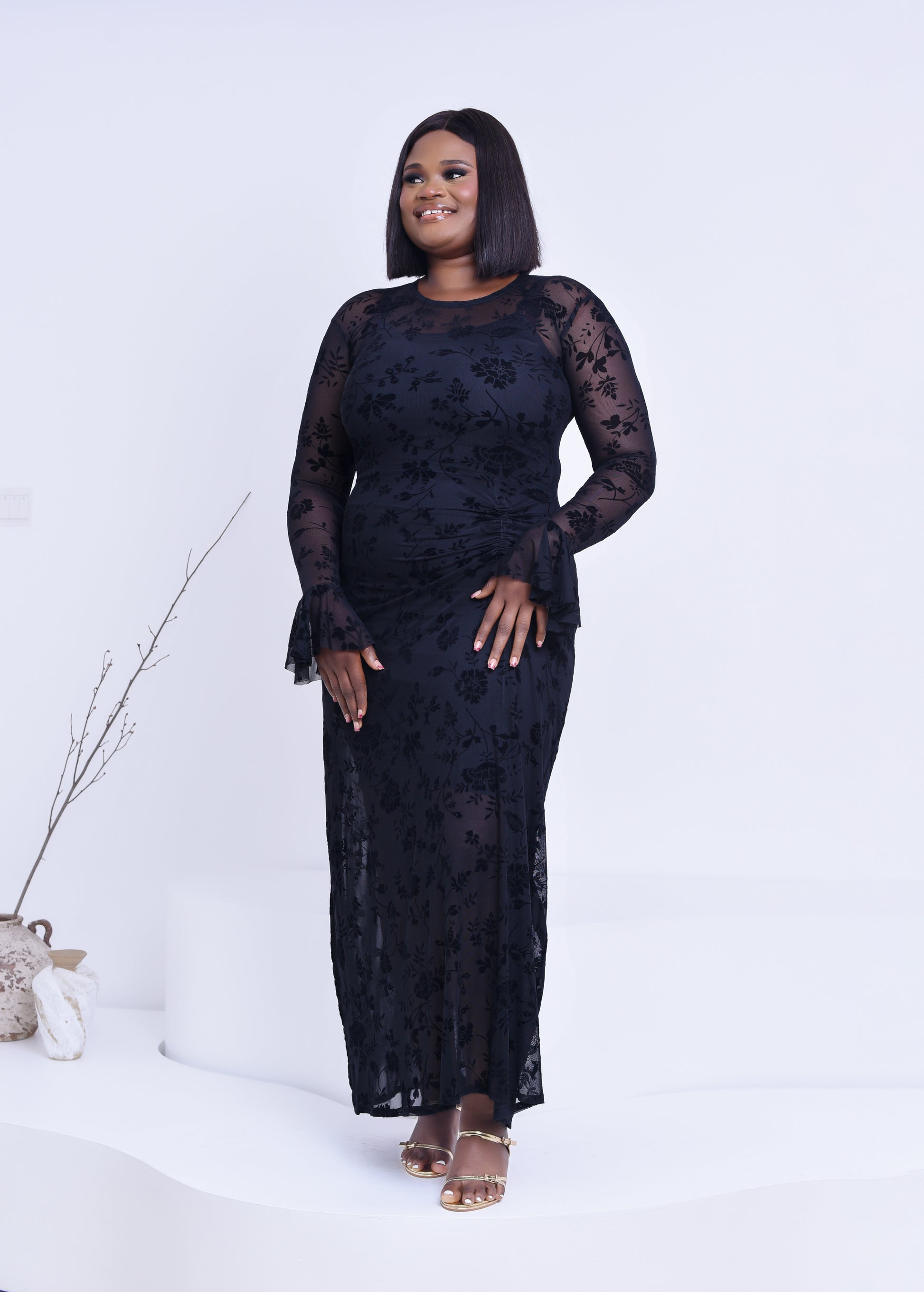 Maxi floral round neck dress. Flared sleeves and synching by the waist line. Dress comes with inner slip dress.