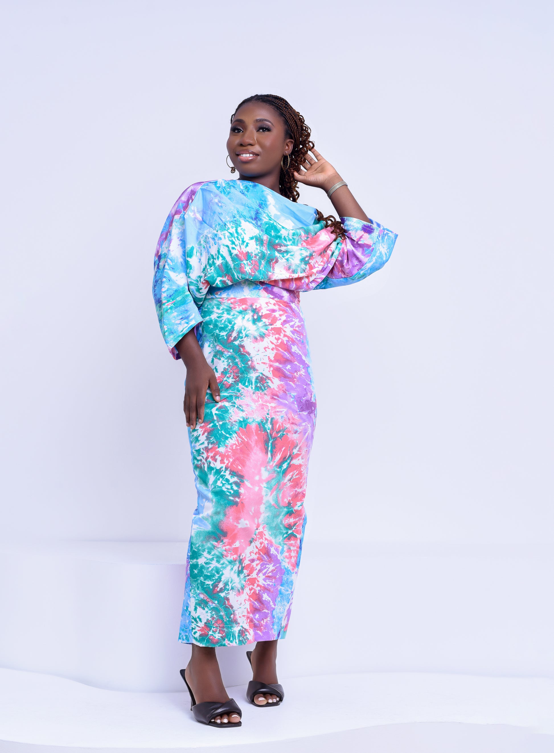 Bright multi-color two piece skirt and top. Top is loose and off the shoulder. Midi skirt has zipper on the back.