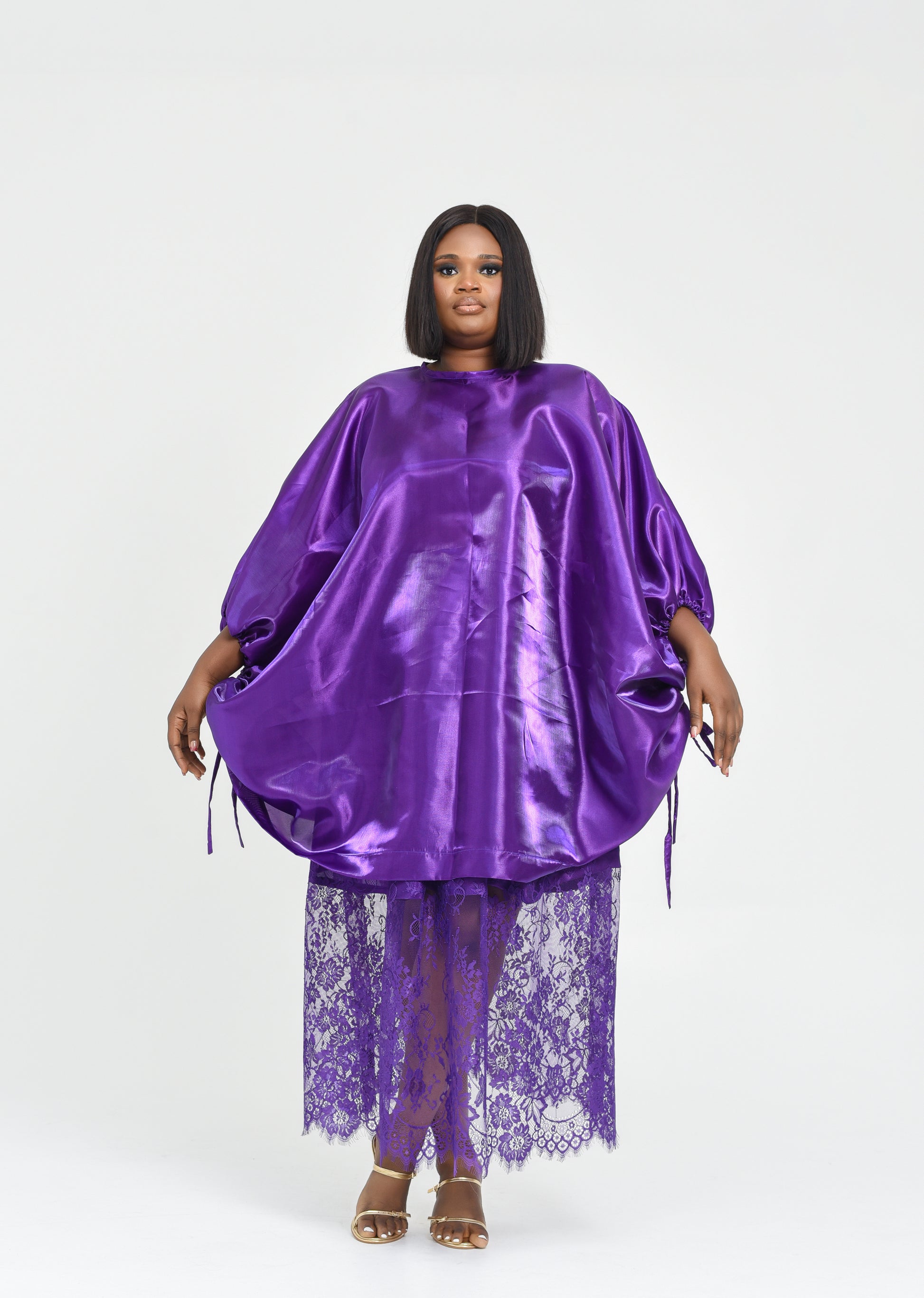Knee length, lace skirt with an elastic band on both sides. Skirt is lined to the knee. Over sized top with 3/4 sleeves that include elastic and strings on both sides. Skirt is fitted, size up for in between sizes.